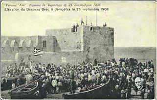 -Στα Χανιά, στις 25 Σεπτεμβρίου 1908, κηρύχθηκε η κατάργηση της Αρμοστείας και η ένωση με την Ελλάδα. Την επόμενη μέρα, η επίσημη κυβέρνηση της Κρήτης εξέδωσε αντίστοιχο ενωτικό ψήφισμα και η κρητική βουλή, αφού το επικύρωσε, προχώρησε στην κατάργηση της Αρμοστείας και του κρητικού Συντάγματος και στην εισαγωγή του Ελληνικού.