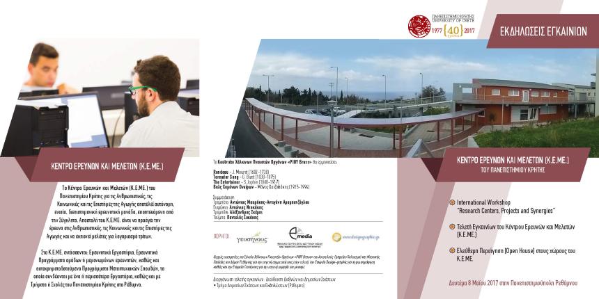 Το Πανεπιστήμιο Κρήτης θα πραγματοποιήσει την τελετή εγκαινίων του Κέντρου Ερευνών και Μελετών (Κ.Ε.ΜΕ.) για τις Ανθρωπιστικές, τις Κοινωνικές και τις Επιστήμες Αγωγής *την Δευτέρα 8 Μαΐου 2017 και ώρα 17.30 στον προαύλιο χώρο του Κ.Ε.ΜΕ. στην Πανεπιστημιούπολη Ρεθύμνου.