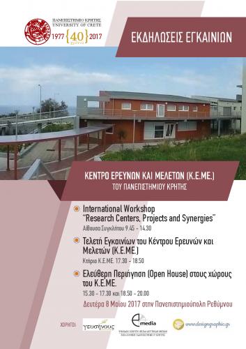 Στο πλαίσιο της εκδήλωσης των εγκαινίων, θα πραγματοποιηθεί την ίδια ημέρα Διεθνές Συμπόσιο με θέμα: “Research Centers, Projects and Synergies” (Αίθουσα Συγκλήτου, Πανεπιστημιούπολη Ρεθύμνου, 09.45 - 14.30), καθώς και Ελεύθερη Περιήγηση (Open House) στους χώρους του Κ.Ε.ΜΕ. (15.30 - 17.30 και 18.50 - 20.00).