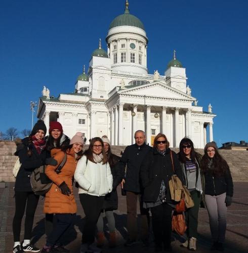Οι Έλληνες μαθητές και εκπαιδευτικοί, μετά από ένα τρίωρο αεροπορικό ταξίδι, έφτασαν στο αεροδρόμιο της Βάνταα και από κει στην παγωμένη αλλά άκρως εντυπωσιακή πρωτεύουσα της Φινλανδίας, το σύγχρονο και κοσμοπολίτικο Ελσίνκι. Η πόλη είναι χτισμένη σε μια στενή λωρίδα γης, η οποία εισβάλλει στα νερά της Βαλτικής με πολλές μικρές χερσονήσους και άπειρα μικρά νησάκια. Η ομορφιά της γύρω φύσης εναρμονίζεται με τα εντυπωσιακά τεχνολογικά επιτεύγματα και τις σύγχρονες τάσεις. Περπατώντας στο κέντρο της πόλης ανακαλύπτει κανείς την πολύμορφη ιστορία της με νεοκλασικές προσόψεις, σοβιετικά μονοκόμματα κτίρια , αλλά και τη σύγχρονη αρχιτεκτονική με τις υπερμοντέρνες κατασκευές. Εξάλλου, οι Φινλανδοί πρωτοπορούν στο ντιζάιν και στην αρχιτεκτονική διεθνώς.