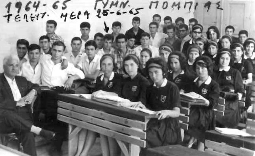 Νωρίς το πρωί, φτάσαμε στην Πόμπια και βρεθήκαμε στο σχολείο. Από την πρώτη στιγμή ένιωσα δέος. Ένας απέραντος χώρος, με περίπου 200 παιδιά από όλα τα χωριά της επαρχίας Καινουργίου, Πυργιωτίσσης, Μονοφατσίου αλλά και τα ανατολικά του Αμαρίου και του Αγίου Βασιλείου. Με τα κοντά παντελονάκια μου χάζευα το μελλοντικό μου «σπίτι» που με τρόμαζε και με γοήτευε ταυτόχρονα. Ήταν από τις λίγες φορές που βρέθηκα στο κεφαλοχώρι της περιοχής και κάθε γωνιά, κάθε πρόσωπο, μου φάνταζε ως κάτι νέο, γεμάτο υποσχέσεις για κάτι μεγαλύτερο και άγνωστο.
