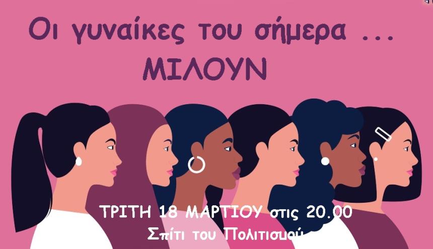 20.00 : "Οι γυναίκες του σήμερα ...ΜΙΛΟΥΝ" ομιλίες με εκπροσώπους φορέων για την γυναίκα του σήμερα.