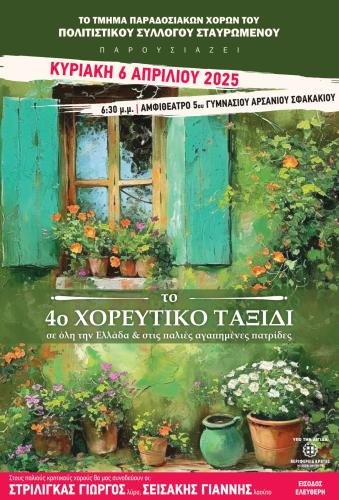 Το τμήμα παραδοσιακών χορών του Πολιτιστικού Συλλόγου Σταυρωμένου , σας προσκαλεί την Κυριακή 6 Απριλίου στις 18:30 , στο αμφιθέατρου του 5ου Αρσάνιου Γυμνασίου Σφακακίου.