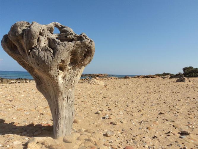 Στ’ αριστερά μου βρισκόταν ο Λαυρακάς, το μισό κομμάτι της αμμώδους παραλίας του οποίου καλύπτονταν από σκιά που δημιουργούσε ο βράχος πάνω στον οποίο βρισκόμουν κι από το σημείο που σκάει το κύμα ξεκινούσε ένα ζευγάρι από ίχνη ανθρώπινων βημάτων τα οποία χάνονταν μες στη σκιά. Απέναντι μου είχα τη Γαυδοπούλα, μια ακατοίκητη νησίδα, την οποία επισκέπτονται οι ντόπιοι με βάρκες και μαζεύουν αλάτι από τα βράχια της, ενώ στα δεξιά μου, η έλλειψη σύννεφων, μου επέτρεπε να δω τα χιονισμένα Λευκά Όρη.