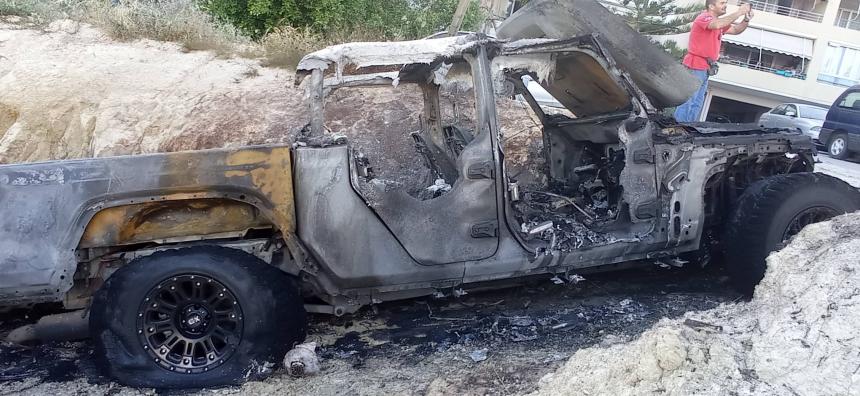 Η φωτιά ξεκίνησε από ένα τζιπ και απλώθηκε ακολούθως στα διπλανά οχήματα αλλά και σε ένα στύλο της ΔΕΗ.