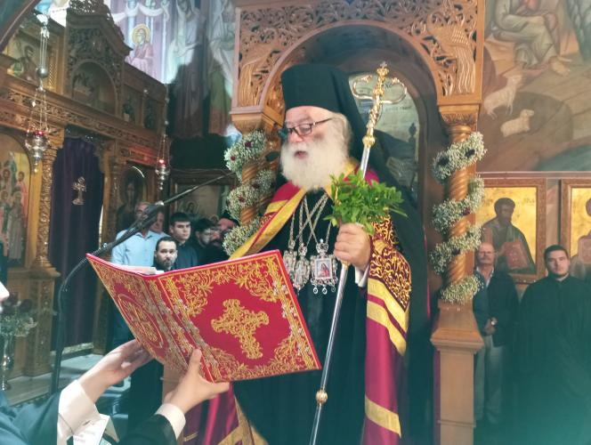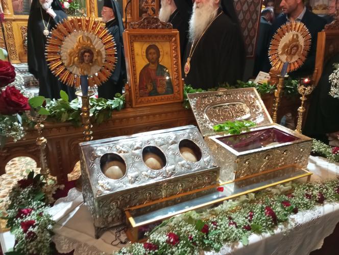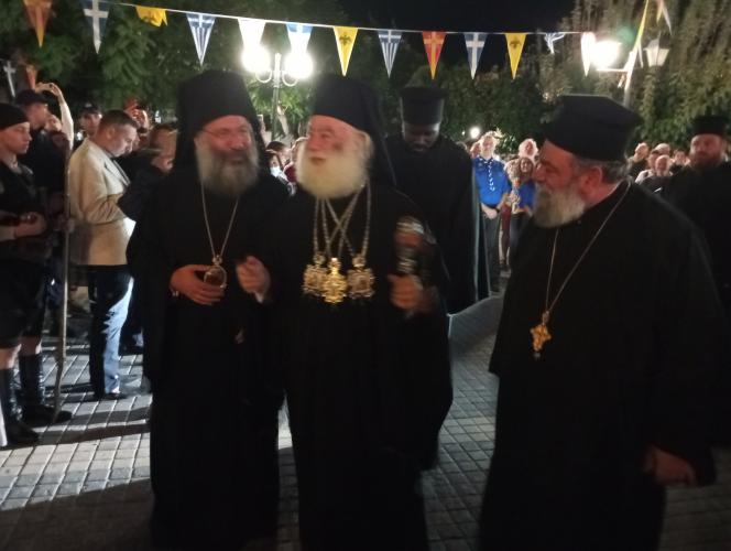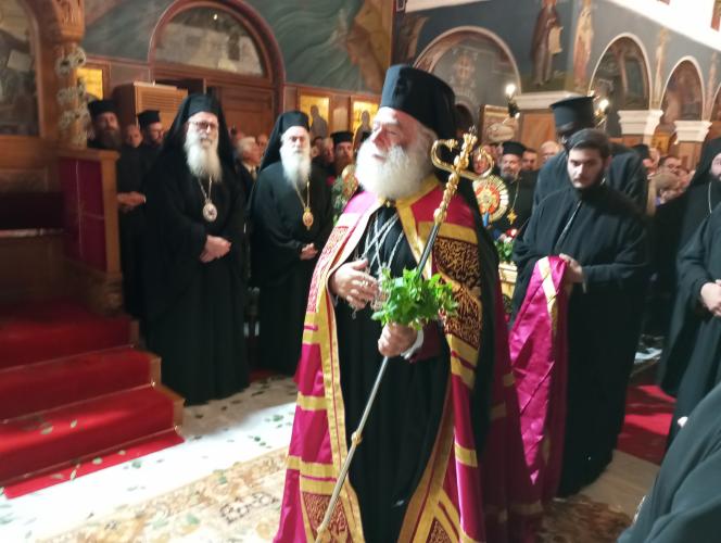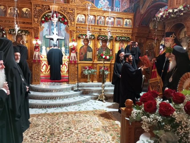 Ο Μακαριώτατος ανέβηκε στον θρόνο και προέστη του Πατριαρχικού Πανηγυρικού Εσπερινού ευλογώντας τους πιστούς που είχαν κατακλείσει τον Ιερό Ναό που βρίσκεται στο σημείο όπου καρατομήθηκαν το 1824 οι Νεομάρτυρες Γεώργιος, Αγγελής, Μανουήλ και Νικόλαος.