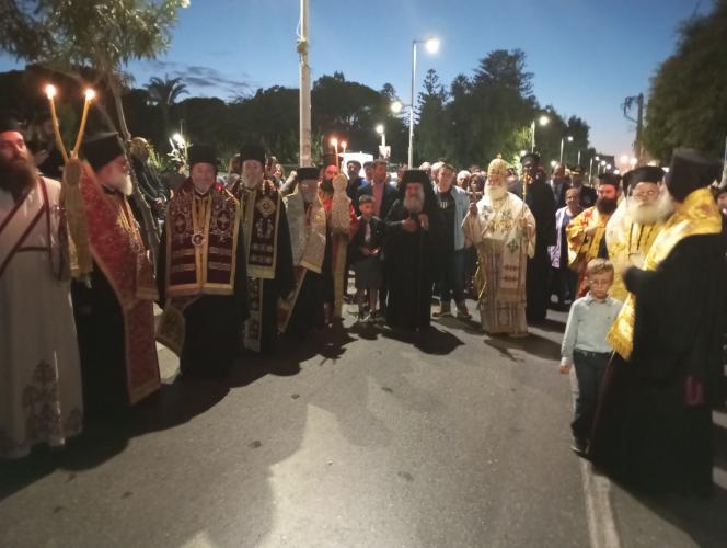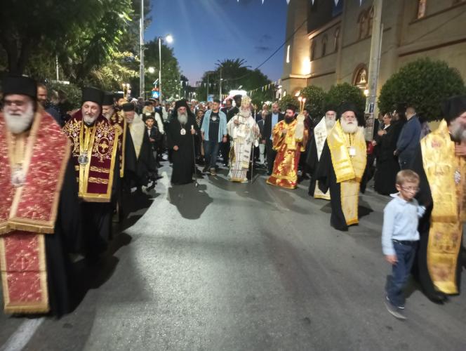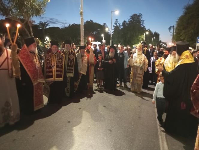 Επικεφαλής της πομπής ήταν η Α.Θ.Π. ο Πάπας και Πατριάρχης Αλεξανδρείας κ.κ. Θεόδωρος. Συμμετείχαν ο Αρχιεπίσκοπος Κρήτης κ. Ευγένιος, ο Μητροπολίτης Ανέων κ. Μακάριος, ο Μητροπολίτης Ρεθύμνης και Αυλοποτάμου κ. Πρόδρομος, ο Μητροπολίτης Κυδωνίας και Αποκορώνου κ. Δαμασκηνός, ο Μητροπολίτης Ιεραπύτνης και Σητείας κ. Κύριλλος, ο Μητροπολίτης Αμορίου κ. Νικηφόρος, ο Επίσκοπος Θεσπιών κ. Παύλος και ο Επίσκοπος Κνωσού κ. Μεθόδιος.