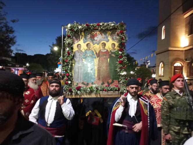 Οι κάρες και τα Ιερά Λείψανα των Αγίων, η Θαυματουργή Εικόνα της Παναγίας της Αντιφωνήτριας από τα Μυριοκέφαλα, η πρώτη Εικόνα των Αγίων που ιστορήθηκε το 1836 και το γιαταγάνι, με το οποίο καρατομήθηκαν οι Μάρτυρες Μανουήλ, Νικόλαος, Αγγελής και Γεώργιος το 1824, ήταν στο επίκεντρο της λιτανείας στο στο κέντρο της πόλης.