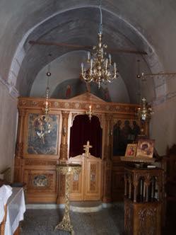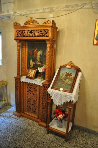 Το εσωτερικό του ναού κοσμείται από ένα ξυλόγλυπτο τέμπλο, όπου δεσπόζει η εικόνα του Αγίου Γεωργίου, έργο του ζωγράφου Ιωάννη Φραγκόπουλου, φιλοτεχνημένη το 1844. Στο ιερό συναντάται μια ακόμη εικόνα του Αγίου, αυτή τη φορά από τον Κωνσταντίνο Σινωπέα, χρονολογημένη το 1871. Η τελευταία ανακαίνιση του ναού πραγματοποιήθηκε το 1954, διατηρώντας την αρχική του μορφή, ενώ προστέθηκε και ένα μικρό, λιτό καμπαναριό, που ολοκληρώνει την εικόνα του ναού.
