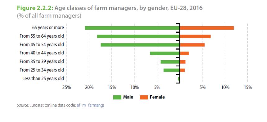 Επτά στους δέκα (71,5%) αρχηγούς αγροτικών εκμεταλλεύσεων, στις 10,5 εκατ. εκμεταλλεύσεις της ΕΕ, είναι άνδρες, με την πλειοψηφία (57,9%) να είναι 55 ετών ή περισσότερο. Μόνο ένας στους δέκα (10,6%) αρχηγούς είναι νέος αγρότης ηλικίας κάτω των 40 ετών, όπως φαίνεται και στο διάγραμμα, ενώ το ποσοστό αυτό είναι ακόμη χαμηλότερο για τις γυναίκες (8,6%).