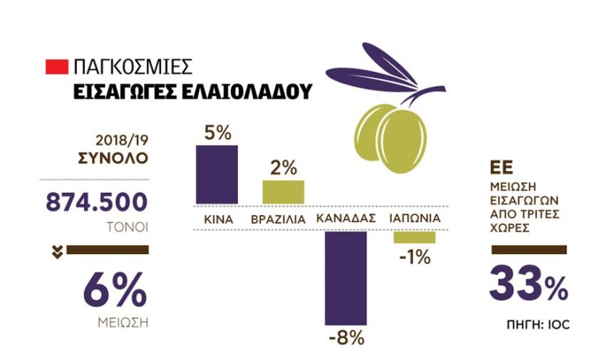 Υπενθυμίζεται ότι στο κλείσιμο της περιόδου 2017/18, οι εισαγωγές ελαιολάδου είχαν σημειώσει αύξηση κατά 29% στην Βραζιλία, 18% στον Καναδά, 7% στην Αυστραλία, 4% στην Ρωσία και 2% στις ΗΠΑ, ενώ παρέμειναν σταθερές σε Ιαπωνία. Ωστόσο το ενδιαφέρον της Κίνας είχε οδηγήσει σε μια υποχώρηση των εισαγωγών κατά 8%.