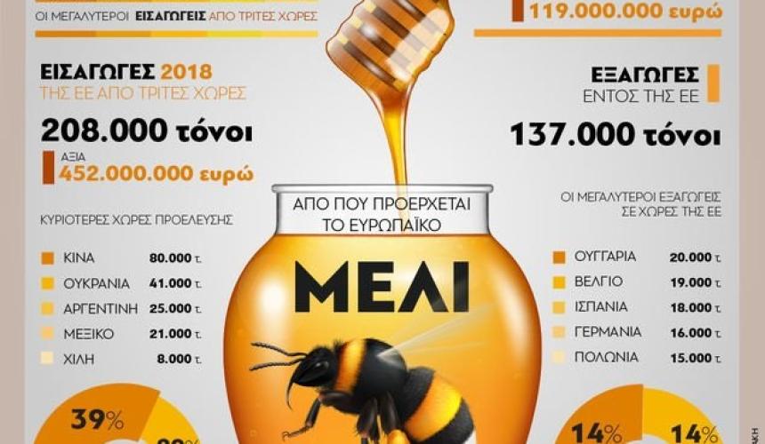 Τους μεγαλύτερους εισαγωγείς μελιού εντός των ευρωπαϊκών συνόρων αποτελούν οι Γερμανία (29%), Ην. Βασίλειο (22%), Βέλγιο (11%), Πολωνία (10%) και Ισπανία (8%), ενώ, στις κυριότερες χώρες προέλευσης συγκαταλέγονται οι Κίνα (80.000 τόνοι), Ουκρανία (41.000 τόνοι), Αργεντινή (25.000 τ.), Μεξικό (21.000 τ.) και Χιλή (8.000 τ.).