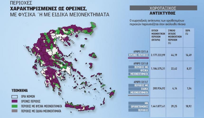 -Με φυσικά µειονεκτήµατα: 12.693.410 στρέµµατα (πρώην ορισµός) έναντι 11.045.750 στρέµµατα µε το νέο ορισµό.