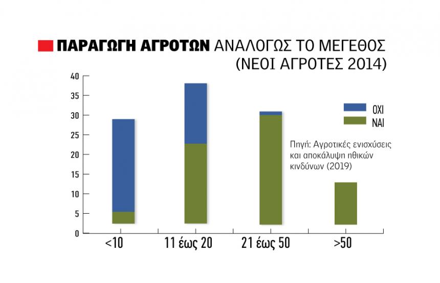 ∆εύτερον, το µέγεθος της εκµετάλλευση: Σύµφωνα µε παράδειγµα το οποίο προκύπτει αποτελεσµατικότητα του µέτρου για την εγκατάσταση νέων γεωργών στην Ιταλία, προέκυψε πως µεταξύ των νέων γεωργών που λαµβάνουν στήριξη, τα ποσοστά εγκατάλειψης είναι σηµαντικά χαµηλότερα για τις εκµεταλλεύσεις που είναι µεγαλύτερες των 160 στρεµµάτων έναντι εκείνων µε µικρότερη έκταση (4,6 % έναντι 9,5 %), όπως και για τους δικαιούχους που εγκαταστάθηκαν σε εκµετάλλευση µε νοµική προσωπικότητα έναντι όσον εγκαταστάθηκαν σε ατοµικές εκµεταλλεύσεις (3,7 % έναντι 6,5 %). Ως εκ τούτου, γίνεται προφανές ότι θα πρέπει στην Ελλάδα να υπάρξει µέριµνα ενίσχυσης µεσαίων κατά βάση εκµεταλλεύσεων και εκτός της τυπικής απόδοσης να υπάρξουν και στρεµµατικά όρια. Επιπλέον, συνίσταται να αξιολογείται το εισόδηµα της εκµετάλλευσης —όπως είχε αρχικώς εκτιµηθεί (πριν από την υλοποίηση του έργου)— προκειµένου να αξιολογηθεί η δυνατότητά της να χρηµατοδοτήσει αφ’ εαυτής τις επενδύσεις της.