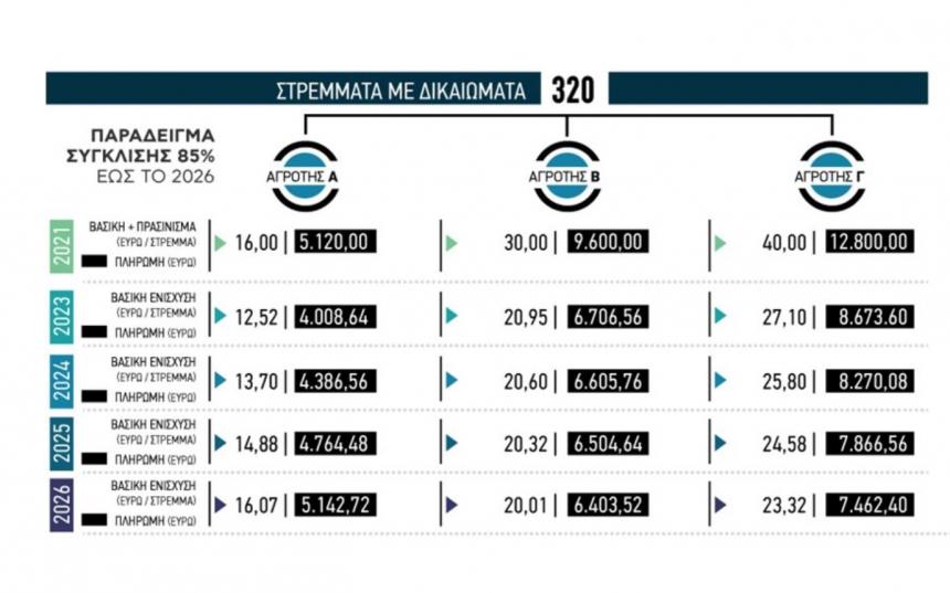 Αγρότης Α: από τα 5.120 ευρώ που πληρώθηκε το 2021 βάσει 320 στρεµµάτων, θα ξεκινήσει από µία πληρωµή βασικής ενίσχυσης 4.008,64 ευρώ το 2023 (µείωση 1,111,36 ευρώ ή 21,7%). Αυτό το ποσό θα αυξηθεί σταθερά και θα φτάσει στα 5.142,72 ευρώ έως το 2026.