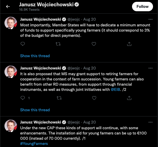 Με μια σειρά αναρτήσεων στο Twitter ο Επίτροπος Γεωργίας του μπλοκ, Γιάνουζ Βοϊτσεχόφσκι, φωτογραφίζει τις δράσεις του πριμ πρώτης εγκατάστασης, του πριμ εξόδου αγροτών κοντά στη συνταξιοδότηση και τη δυνατότητα να δοθεί αυξημένη συμπληρωματική ενίσχυση σε νέους αγρότες από τα κονδύλια του πρώτου πυλώνα της ΚΑΠ, λέγοντας ότι δίπλα στις κλιματικές ευαισθησίες της νέας ΚΑΠ, αιχμή της νέας μεταρρύθμισης είναι και οι προσπάθειες ανανέωσης των γενεών στην ύπαιθρο.