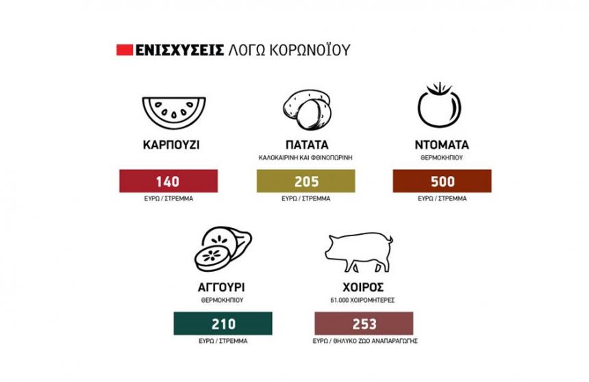 Και να σημειωθεί ότι πρόκειται για ένα κονδύλι της τάξης των 40 περίπου εκατ. ευρώ το οποίο αφορά παραγωγούς υπαίθριου καρπουζιού, mini και obla, καλοκαιρινής και φθινοπωρινής πατάτας, θερµοκηπιακών καλλιεργειών σε ντοµάτες-αγγούρια όλης της χώρας πλην Κρήτης και βουβαλοτροφίας, συνολικού ποσού 24,2 εκατ. ευρώ και την ενίσχυση 253 ευρώ ανά θηλυκό ζώο αναπαραγωγής για 61.000 χοιροµητέρες συνολικού ποσού 15,5 εκατ. ευρώ. Σημειωτέον τα ποσά αυτά έχουν ήδη εγκριθεί, αλλά δεν έχουν ακόμα λάβει την απαραίτητη υπογραφή του αναπληρωτή υπουργού Οικονομικών Θεόδωρου Σκυλακάκη στις σχετικές αποφάσεις έγκρισης πιστώσεων. Εν τω μεταξύ θα πρέπει να ολοκληρωθούν και οι διασταυρωτικοί έλεγχοι από τον ΟΠΕΚΕΠΕ, αλλά και οι αντίστοιχοι του υπουργείου Οικονοµικών.