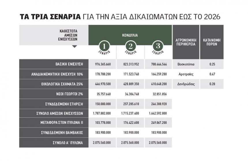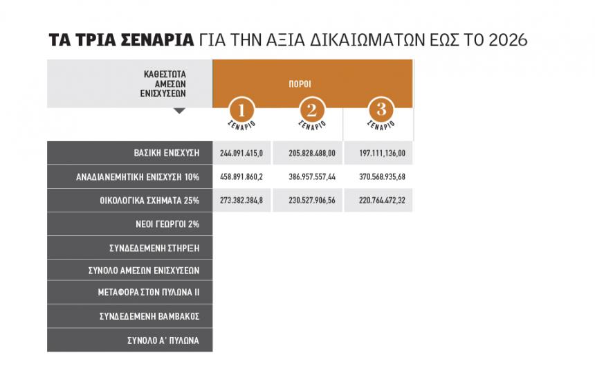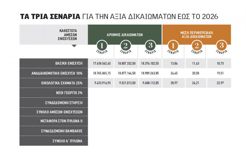 Στα τρία σενάρια, η µέση αξία των δικαιωµάτων αφορά το 2026. Μόνο για τα έτη 2023 και 2024 πρέπει να ληφθεί υπόψη και ο παράγοντας των κονδυλίων από το νέο πρασίνισµα (οικολογικά σχήµατα), µερίδα των οποίων µπορεί να µεταφερθούν στη βασική ενίσχυση εφόσον δεν απορροφηθούν πλήρως από τις δράσεις που θα προκηρυχθούν. Για τα έτη 2025 και 2026 αυτό δεν ισχύει και θα πρέπει όσα χρήµατα αφιερωθούν στο νέο πρασίνισµα να απορροφηθούν πλήρως, αλλιώς επιστρέφουν πίσω στα ευρωπαϊκά ταµεία.