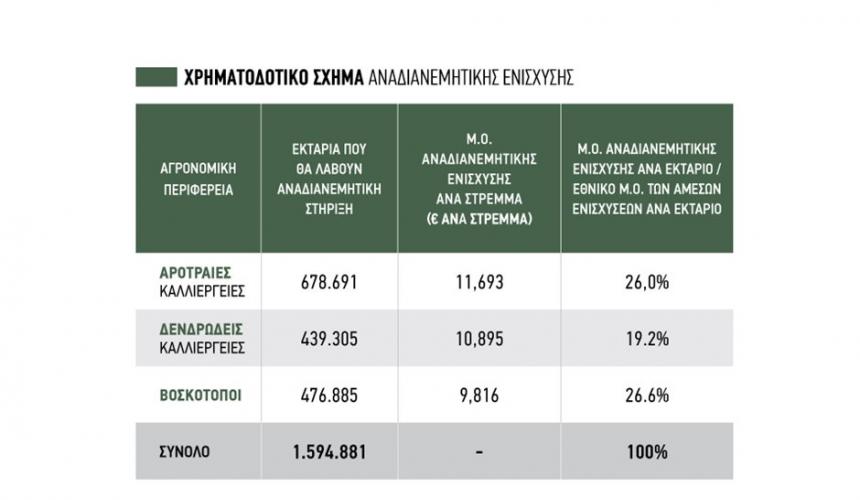 Ο µέσος όρος της αναδιανεµητικής στήριξης ανά εκτάριο, υπολογίστηκε σε 116,93 ευρώ στην αγρονοµική περιφέρεια των αρόσιµων καλλιεργειών, σε 108,95 ευρώ στην αγρονοµική περιφέρεια των µόνιµων καλλιεργειών και σε 98,16 ευρώ στην αγρονοµική περιφέρεια των βοσκοτόπων. Όπως βλέπουµε στον επόµενο πίνακα, οι τιµές αυτές της αναδιανεµητικής ενίσχυσης αντιστοιχούν σε ένα σχετικά χαµηλό ποσοστό του εθνικού µέσου όρου των άµεσων ενισχύσεων: 26,0% στην αγρονοµική περιφέρεια των αρόσιµων καλλιεργειών, σε 19,2% στην αγρονοµική περιφέρεια των µόνιµων καλλιεργειών και σε 26,6% στην αγρονοµική περιφέρεια των βοσκοτόπων. Από την επεξεργασία των στοιχείων του ΟΣ∆Ε για το 2019 εκτιµάται ότι κατά την περίοδο 2023-2027 θα λάβουν αναδιανεµητική ενίσχυση 423.309 εκµεταλλεύσεις. εκτιµάται ότι θα δοθεί αναδιανεµητική ενίσχυση σε 1.594.881 εκτάρια, τα οποία αντιστοιχούν στο 41,1% των συνολικών επιλέξιµων εκταρίων.