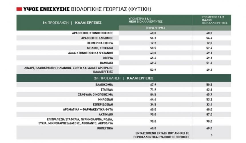 Συγκεκριµένα, όπως έχει γίνει γνωστό στο νέο πρασίνισµα το 2023 (άµεσες ενισχύσεις) θα µπορούν να µπουν όσοι διατηρούν τις βιολογικές πρακτικές, µε το σχετικό πρόγραµµα του ΠΑΑ να καταργείται. Έτσι, όσοι ενταχθούν στη φετινή πρόσκληση (για διατήρηση) θα λαµβάνουν εώς το 2025 το ποσό που προβλέπει η ένταξη. Οι υπόλοιποι και όσοι µείνουν εκτός λόγω περιορισµού στον προϋπολογισµό, θα λαµβάνουν στρεµµατικές ενισχύσεις από το πρασίνισµα για τη διατήρηση της βιολογικής από το 2023 (προβλεπόµενος προϋπολογισµός 65 εκατ. ευρώ ετησίως). Συγκρητικά λοιπόν τα πριµ σε ορισµένες καλλιέργειες ως εξής: