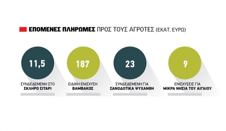 Το µόνο σίγουρο είναι ότι οι πρώτες πληρωµές που θα γίνουν θα αφορούν την εξόφληση υπολοίπων από γεωργοπεριβαλλοντικά προγράµµατα, µετά και την έκδοση των αποφάσεων µε την έγκριση πίστωσης 15 εκατ. ευρώ για τη Νιτρορύπανση, καθώς και 137.514,56 ευρώ για τον αµπελώνα Θήρας και 226.032,86 ευρώ για τους τους Ελαιώνες Άµφισσας, για τους δικαιούχους της 1ης πρόσκλησης κάθε δράσης. Αντίστοιχες αποφάσεις αναµένονται και για τα Βιολογικά και τις Σπάνιες Φυλές, προκειµένου να δοθεί µια πρώτη ανάσα στον αγροτικό κόσµο. Μαζί µε τις ανωτέρω πληρωµές, το επόµενο διάστηµα να σηµειωθεί ότι δροµολογείται και η πίστωση των ενισχύσεων για τα ειδικά καθεστώτα για τα µικρά νησιά του Αιγαίου.