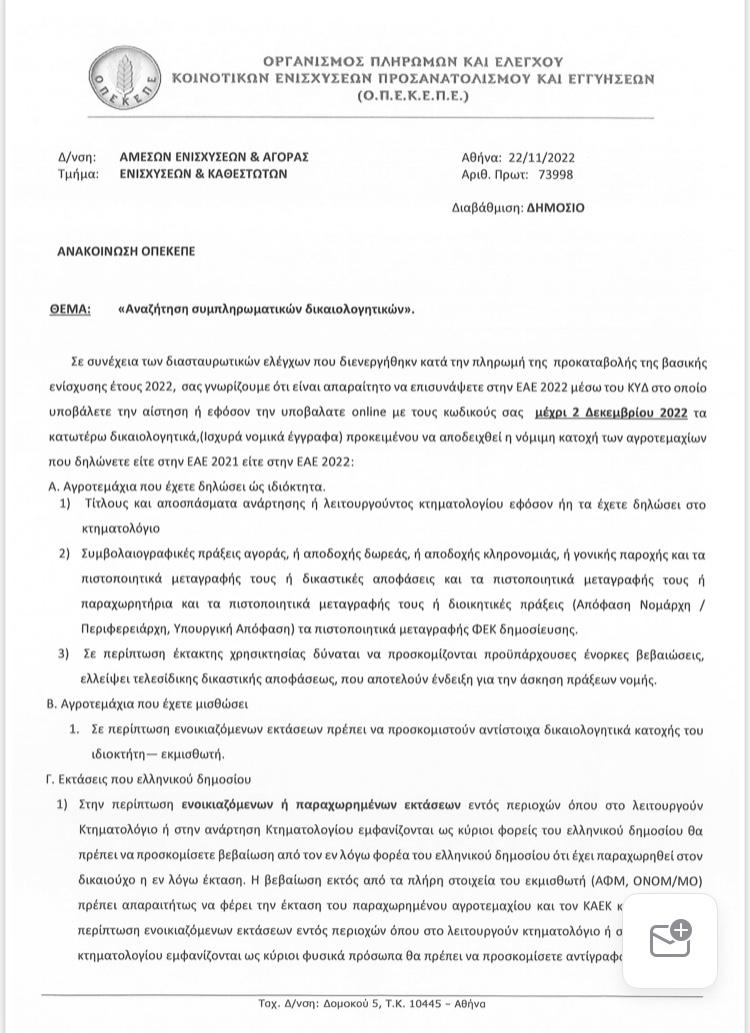 Δείγμα η ανακοίνωση – παρωδία, που έβγαλε στις 23 Νοεμβρίου ο ΟΠΕΚΕΠΕ για τα δικαιολογητικά νόμιμης κατοχής αγροτεμαχίων που πρέπει να προσκομίσουν οι παραγωγοί. Ούτε τα τυπικά που αφορούν την ορθογραφία και το συντακτικό δεν μπορούν να τηρήσουν αφού η βιασύνη τους είναι τέτοια που τους κάνει να στέλνουν σοβαρές επιστολές χωρίς να τις ελέγξουν πριν τις κοινοποιήσουν.