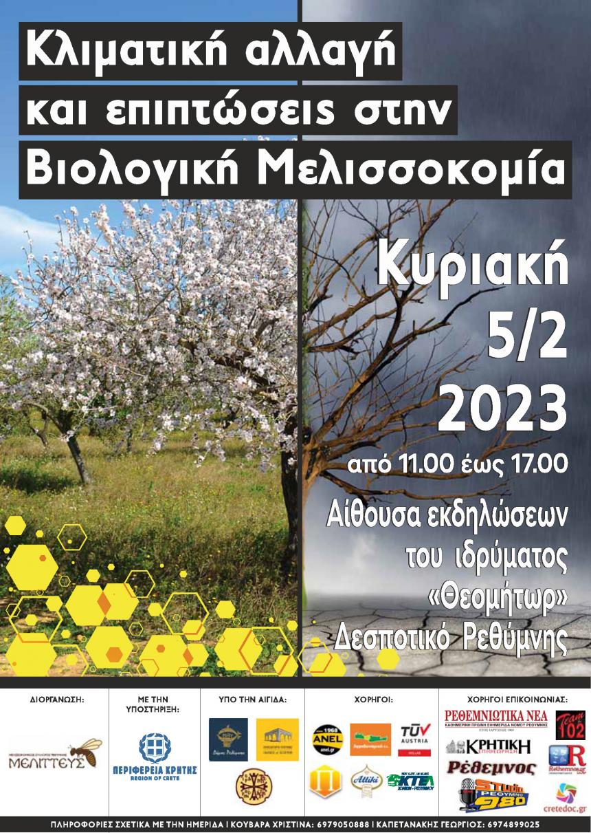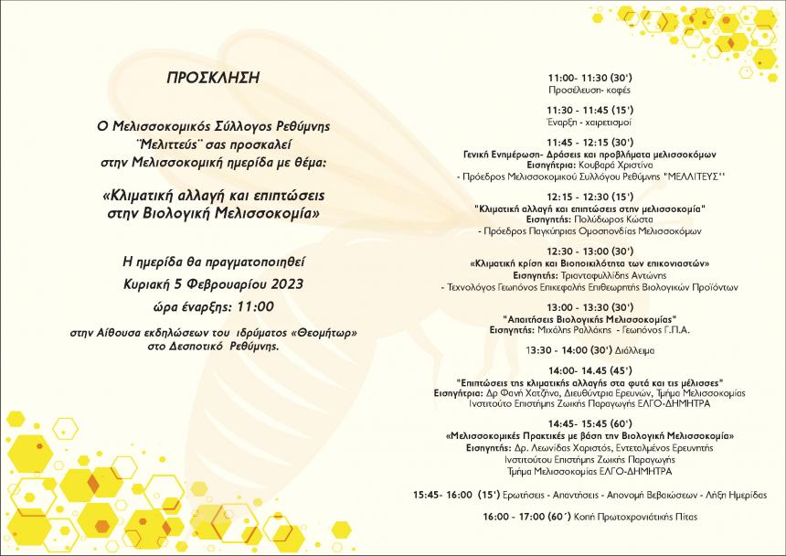 Με ιδιαίτερο ενδιαφέρον θα πραγματοποιηθεί ημερίδα του Μελισσοκομικού Συλλόγου Ρεθύμνης «ΜΕΛΙΤΤΕΥΣ» με θέμα «Κλιματική αλλαγή και επιπτώσεις στην Βιολογική Μελισσοκομία» την Κυριακή 5 Φεβρουαρίου 2023 από 11.00 έως 17.00 στην αίθουσα εκδηλώσεων του ιδρύματος «Θεομήτωρ» - Δεσποτικό Ρεθύμνης