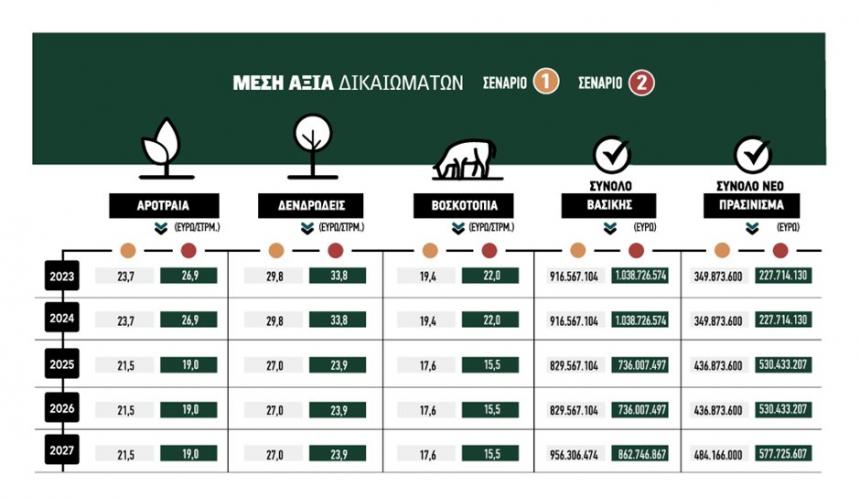 Σενάριο 1: Μεταφορά του 20% των πόρων του νέου πρασινίσµατος τα δύο πρώτα έτη εφαρµογής της ΚΑΠ στη βασική ενίσχυση, για να µην απαιτείται µετά η «επιστροφή» του ποσού. Τα δύο αυτά έτη (2023-2024) η µέση αξία δικαιωµάτων διαµορφώνεται ως εξής: Αροτραία 23,7 ευρώ το στρέµµα, δενδρώδεις 29,8 ευρώ το στρέµµα και βοσκοτόπια 19,4 ευρώ το στρέµµα. Για τα έτη 2025-2027 η αξία δικαιωµάτων διαµορφώνεται ως εξής: Αροτραία 21,5 ευρώ το στρέµµα, δενδρώδεις 27,0 ευρώ το στρέµµα και βοσκοτόπια 17,6 ευρώ το στρέµµα