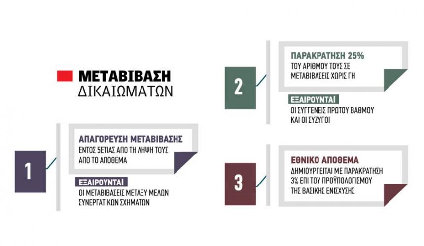 Σηµειώνεται πως η µεταβίβαση δικαιωµάτων βασικής ενίσχυσης που προέρχονται από το Εθνικό Απόθεµα είχε απαγορευτεί, µία απαγόρευση που στη νέα ΚΑΠ θα ισχύει για µία 5ετία. ∆ηλαδή τα δικαιώµατα από το Εθνικό Απόθεµα δεν θα µπορούν να µεταβιβαστούν από το έτος λήψης τους και για 5 έτη. Η συγκεκριµένη τροποποίηση λοιπόν που αφορά τα µέλη συλλογικών σχηµάτων αναµένεται να ισχύσει πάντως και µε βάση τους νέους κανονισµούς. Το σκεπτικό πίσω από αυτήν την απόφαση είναι πως τα δικαιώµατα µε αυτόν τον τρόπο πάνε σε παραγωγικούς αγρότες και θα πρέπει να υπάρξει κάποια διευκόλυνση.