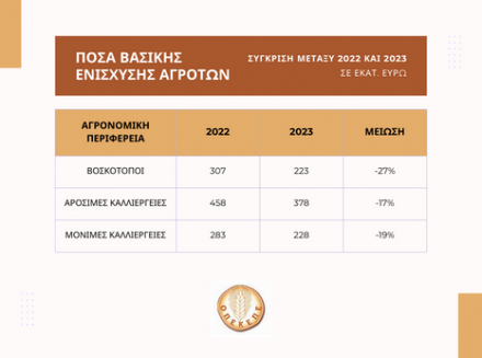 Το συνολικό ποσό της βασικής ενίσχυσης, το οποίο με βάση το Στρατηγικό Σχέδιο της νέας ΚΑΠ κλήθηκε ο ΟΠΕΚΕΠΕ να κατανείμει σε δικαιώματα βασικής ενίσχυσης και να καταβάλει στους δικαιούχους που υπέβαλαν αίτηση το 2023, ήταν 829.000.000 ευρώ σε αντίθεση με πέρυσι που το αντίστοιχο ποσό ήταν πάνω από 1 δις ευρώ.