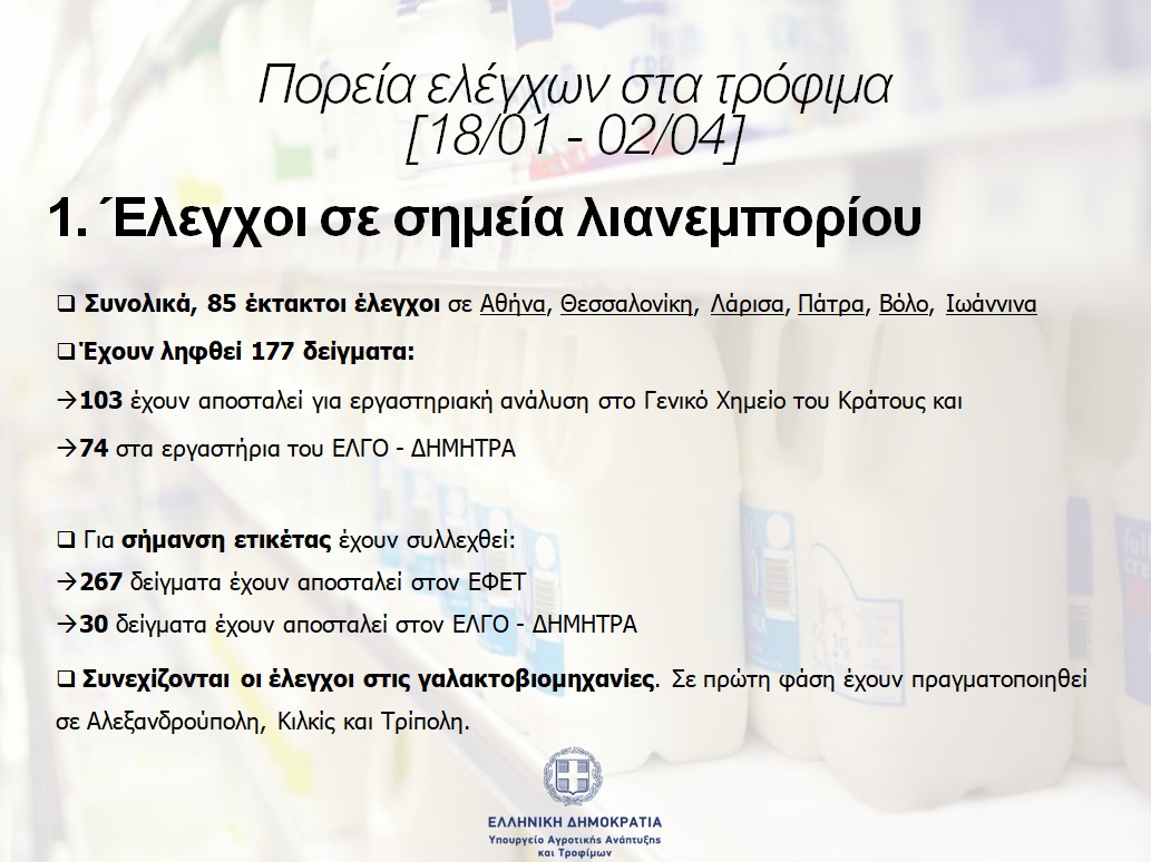 - 177 δείγματα γαλακτοκομικών προς χημικό έλεγχο από σημεία λιανεμπορίου και 267 για έλεγχο ετικέτας