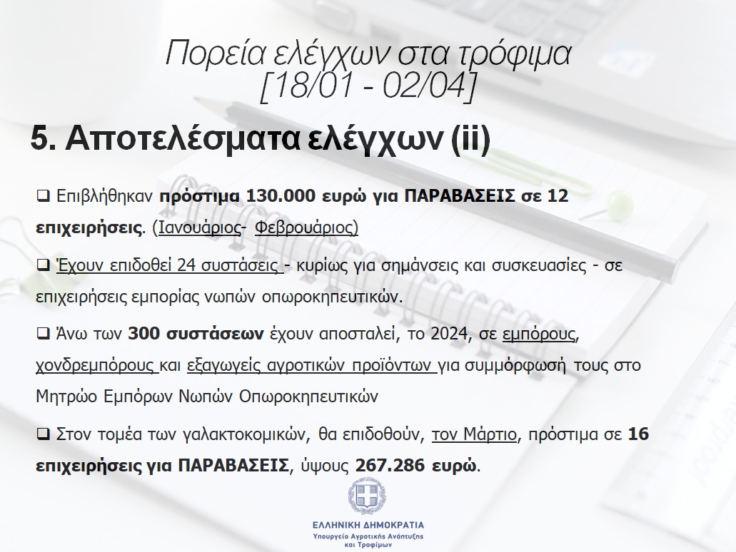 Παράλληλα συνεχίζονται οι έλεγχοι στα γαλακτοκομικά και οπωροκηπευτικά, ενώ έχουν ξεκινήσει έλεγχοι στο ελαιόλαδο και στο μέλι.