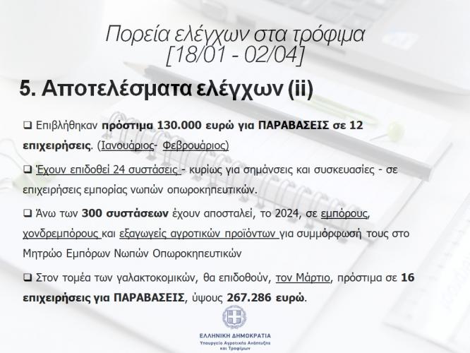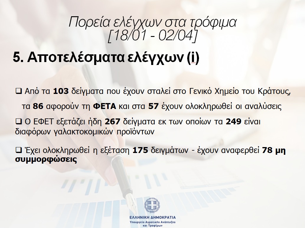 Σημειώνεται ότι δίνεται ιδιαίτερη έμφαση στον έλεγχο προϊόντων ΠΟΠ, όπως η ΦΕΤΑ, που είναι ταυτισμένα με την ελληνική παραγωγή.