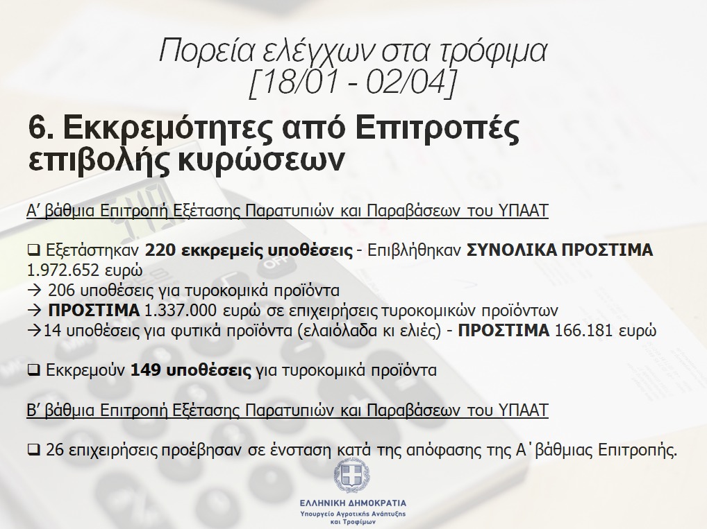 Οι υπόλοιπες 14 υποθέσεις αφορούσαν σε φυτικά προϊόντα (ελαιόλαδα κι ελιές) και τα πρόστιμα που επιβλήθηκαν, είναι 166.181 ευρώ.