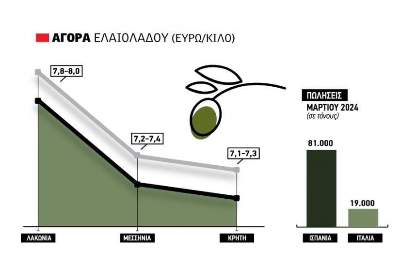 Στην εγχώρια αγορά, παρουσιάζεται κάποια κινητικότητα τόσο από το εγχώριο εµπόριο όσο και από Ιταλούς εµπόρους. Μπορεί να χάθηκαν τα 9 ευρώ για το ελληνικό ελαιόλαδο, ωστόσο η συντήρηση της κατανάλωσης σε ικανοποιητικά επίπεδα σε Ισπανία και Ιταλία, καθώς και η έλευση της τουριστικής περιόδου, αναµένεται να ενεργοποιήσει τα αντανακλαστικά των Ιταλών αγοραστών όσο ζυγώνει ο Μάιος. Αυτές τις µέρες η ελληνική αγορά τοποθετείται σε ένα εύρος τιµών από 7,80 έως 8 ευρώ το κιλό για τις τρεις γραµµές στη Λακωνία. Πριν µια βδοµάδα η εταιρεία Χελιώτης έκλεισε από Αγροτικούς Συνεταιρισµούς της Λακωνίας περίπου 300 τόνους έξτρα παρθένου ελαιόλαδου σε τιµή 8 ευρώ το κιλό, δίνοντας ένα καινούριο σηµείο αναφοράς για τις νέες πράξεις στο νοµό.
