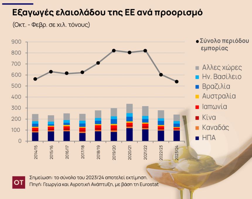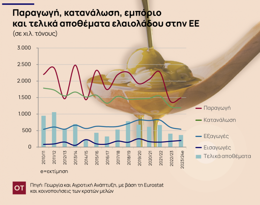 Όμως, παρά την όποια ανάκαμψη της παραγωγής ελαιολάδου στην ΕΕ το 2023/24, τόσο η εγχώρια όσο και η εξαγωγική ζήτηση στην ΕΕ, συνεχίζουν να υποφέρουν από τις υψηλές τιμές.