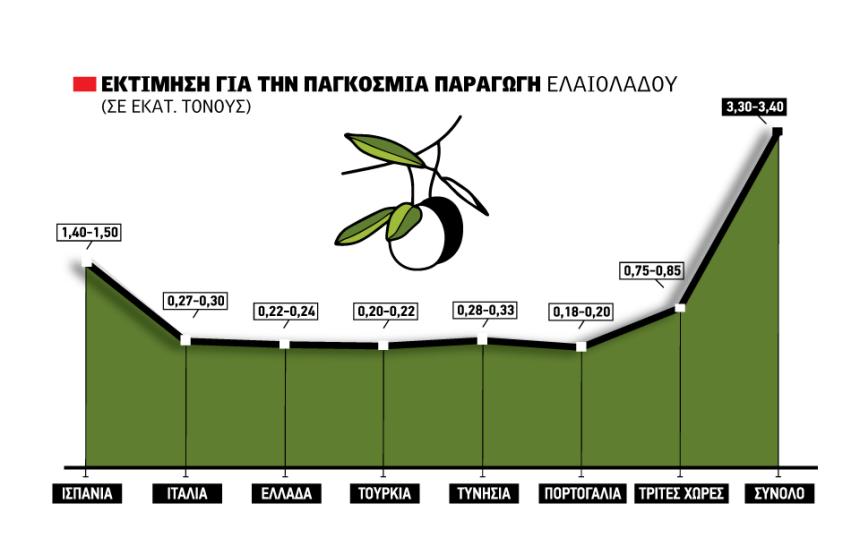 Η Ισπανία πλέον δύσκολα θα γράψει πάνω από 1,5 τόνους, µε το πιθανότερο σενάριο να είναι οι 1,3 µε 1,4 εκατ. τόνοι. Η Τυνησία δεν περιµένει µία πολύ µεγάλη σοδειά, παρά µία ανάλογη της 2024-2025, κοντά στους 300.000 τόνους. Για την Ελλάδα, σύµφωνα µε απόψεις ανθρώπων που εργάζονται στις ∆ΑΟΚ, δύσκολα φέτος θα πιαστούν τα φετινά νούµερα. Μία σοδειά κοντά στους 230.000 τόνους µοιάζει πιο πιθανή. Η γειτονική Τουρκία οδεύει προς µία απογοητευτική χρονιά, κοντά στους 220.000 τόνους. Η Ιταλία προς µία µέτρια σεζόν το πολύ 300.000 τόνων. Αν αθροίσει κανείς Πορτογαλία και τρίτες χώρες, αναµένεται µία σεζόν ανάλογων δυνατοτήτων µε τη φετινή.