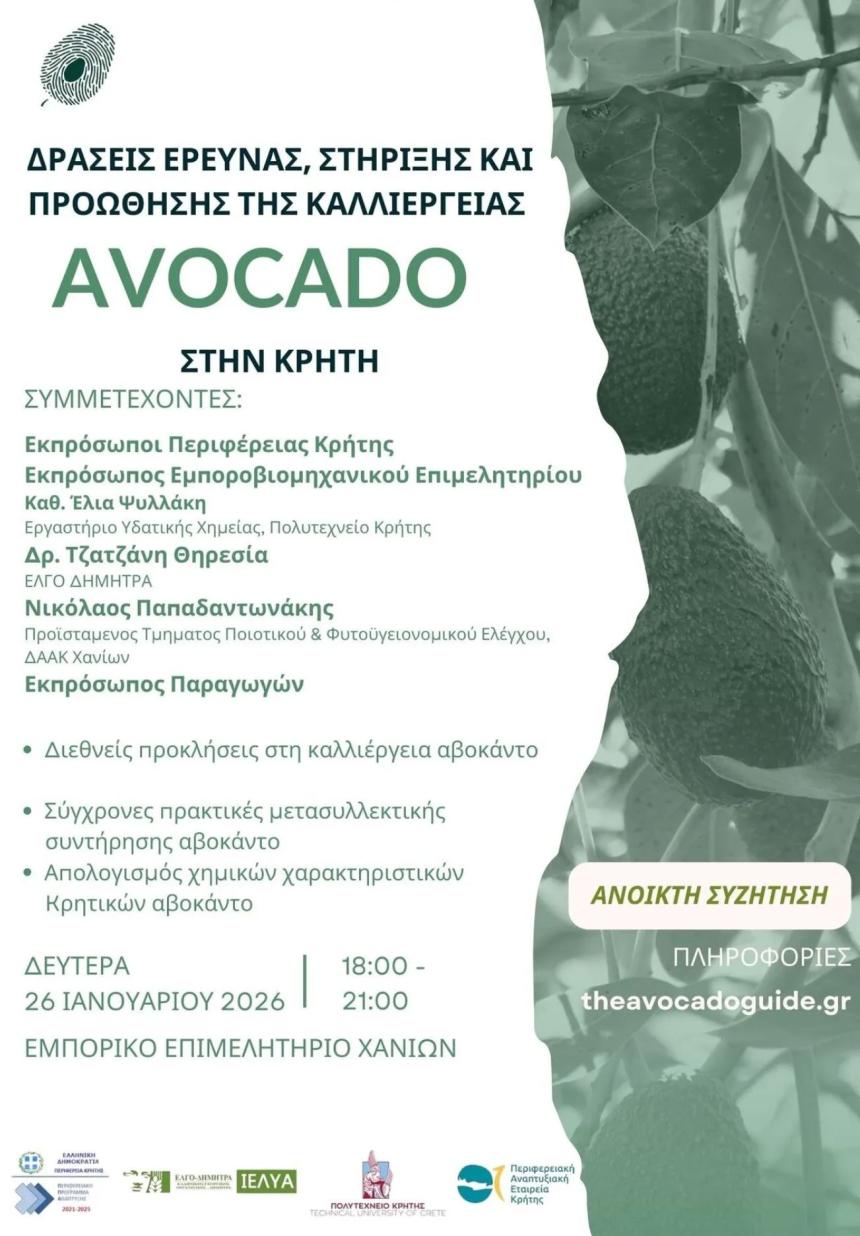 Η Περιφερειακή Αναπτυξιακή Εταιρεία Κρήτης ΑΕ ενημερώνει καλλιεργητές και γεωτεχνικούς καθώς και λοιπούς ενδιαφερόμενους ότι η 4η εκπαιδευτική ημερίδα του έργου «Δράσεις έρευνας, στήριξης και προώθησης της καλλιέργειας του AVOCADO στην Κρήτη», η οποία ήταν προγραμματισμένη να πραγματοποιηθεί σήμερα Τετάρτη 14/1/2026 αναβάλλεται και μεταφέρεται στην Δευτέρα 26/1/2026 και ώρα 18:00-21:00, στο Εμπορικό Επιμελητήριο Χανίων.