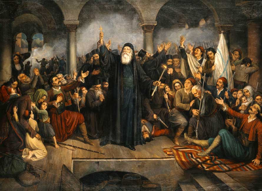 Τα χαράματα της ίδιας μέρας βρήκαν τους πολεμιστές και τα γυναικόπαιδα στη Θεία Λειτουργία. Ο ηγούμενος Γαβριήλ όταν ιερουργούσε τιμώντας τους Αρχαγγέλους Μιχαήλ και Γαβριήλ έφθασε η είδηση ότι οι Τούρκοι βρίσκονται στα υψώματα γύρω από το μοναστήρι. Ο Γαβριήλ τότε ύψωσε τα χέρια του σε στάση προσευχής, έκαμε το σταυρό του και είπε με συγκινημένη φωνή: -«Παιδιά μου θάνατος δεν υπάρχει. Ας πολεμήσωμεν ηρωικά κι ας πάμε στον Πλάστη με καθαρό μέτωπο. Ζήτω ο Πόλεμος, ζήτω η Ελευθερία». –«Ζήτω!» Φωνάζουν όλοι, μ’ όλη τη δύναμη που είχαν. Μετά ακολούθησε δέηση στο Θεό και ο φρούραρχος Δημακόπουλος συμπλήρωσε: «Εις τας θέσεις σας πολεμισταί, εις τας θέσεις σας παιδιά!»