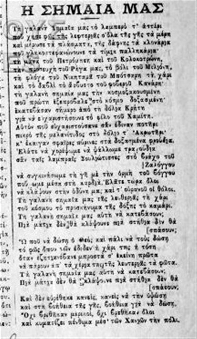 Αυτό το ποίημα δημοσιεύτηκε στην εφημερίδα «Ελλάς» στις 20 Μαΐου 1905. Είναι ένα ποίημα του τυφλού ποιητή Μηνά Τραμπακουλόπουλου με τίτλο «Η σημαία μας» που μιλάει για το γεγονός της υποστολής της ελληνικής σημαίας από τα δημόσια καταστήματα των Χανίων που έγινε στις 26 Απριλίου από τα διεθνή στρατεύματα των εγγυητριών δυνάμεων. Το ποίημα αυτό το απήγγειλε ο ίδιος κατά τη συγκέντρωση διαμαρτυρίας για την υποστολή. Το συγκεκριμένο ποίημα αναφέρεται στα κατορθώματα των Ελλήνων κατά την επανάσταση του 1821 και μιλάει με λόγια θαυμασμού για την ελληνική γαλανόλευκη σημαία. Αυτό απαντάει και στο ερώτημα για το ποια σημαία αναγνώριζαν οι Κρητικοί ως εθνικό σύμβολο.