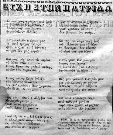 Το πρώτο ποίημα δημοσιεύτηκε στην εφημερίδα «ο Αγών» στις 31 Δεκεμβρίου 1907 με τον τίτλο «Ευχή στην πατρίδα». Η «Ευχή στην πατρίδα» είναι μια ξεκάθαρη ευχή για την ένωση της Κρήτης με την Ελλάδα. Σε όλες τις στροφές του ποιήματος γίνεται λόγος για την αγωνία των Κρητικών και της «μοναχοθυγατέρας» Κρήτης που τη χωρίζουν από τη «μητέρα» Ελλάδα. Στην έκτη στροφή γίνεται αναφορά στη σημαία: