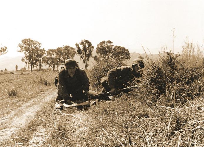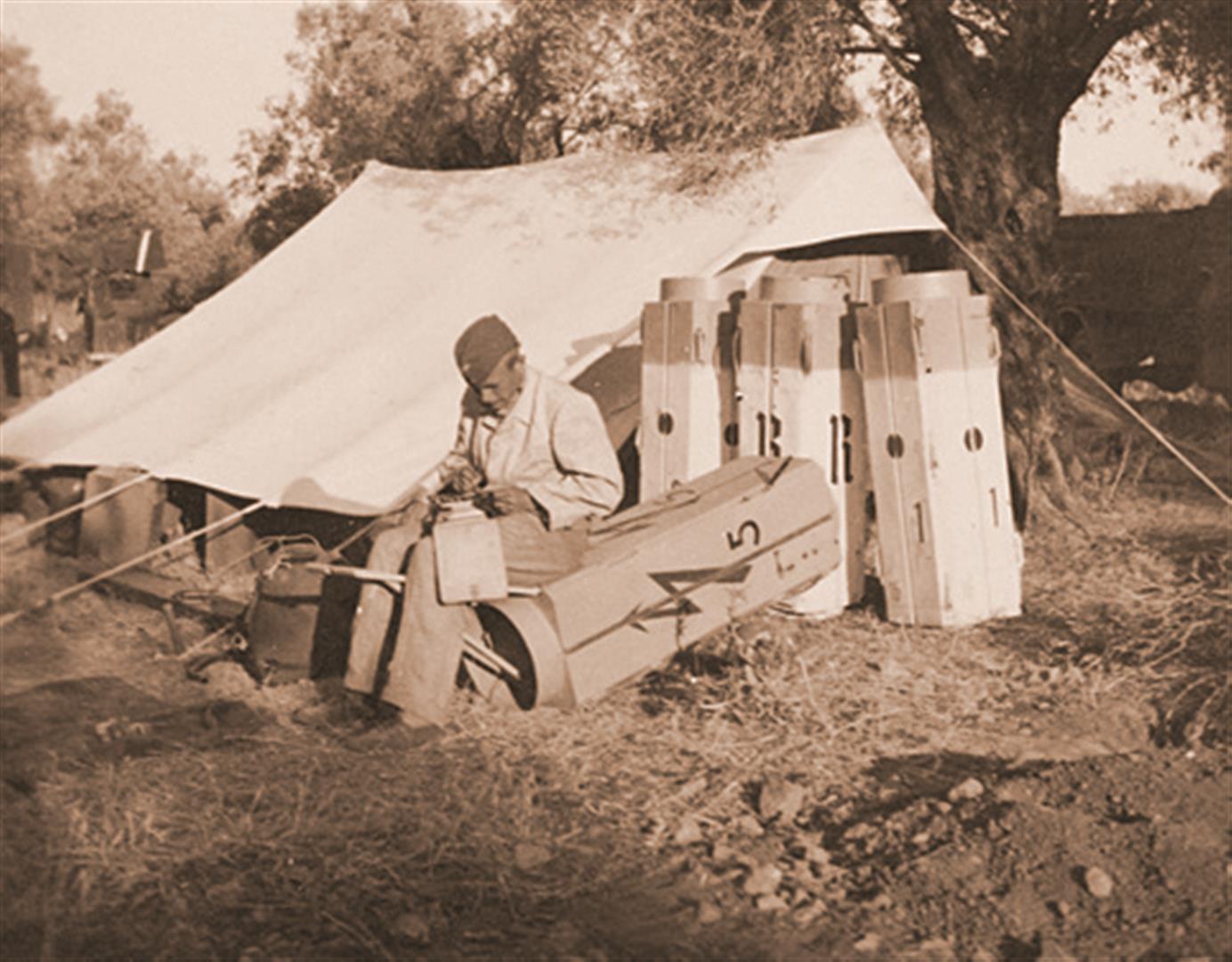 - Αλεξιπτωτιστής χειρίζεται πολυβόλο. Δίπλα στον τρίποδα διακρίνεται μια φωτ. μηχανή Voigtlander στη θήκη της.