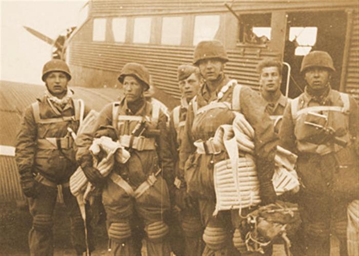 - .Ομάδα Αλεξιπτωτιστών του συντάγματοςΕφόδου, ετοιμάζονται να επιβιβαστούν στο αεροπλάνο που θα τους μεταφέρει στην Κρήτη. Ο πρώτος απο δεξιά, φέρει φωτογραφική μηχανή Leica.