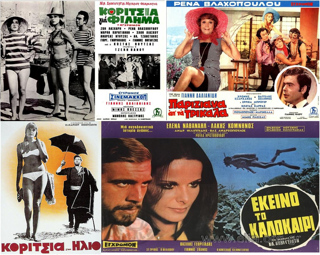 Η πλειοψηφία των ταινιών αυτών ήταν κωμωδίες και μιούζικαλ, διαδραματίζονταν σε νησιά (Ρόδος, Κέρκυρα, Ύδρα, Μύκονος, Αίγινα, Σπέτσες, Πόρος), και έγιναν σημεία συνάντησης των δημοφιλών πρωταγωνιστών και τόποι εξέλιξης της δράσης προάγοντας έναν κοσμοπολίτικο τρόπο διακοπών. Ταινίες γεμάτες ατελείωτους έρωτες, χαβαλέ, κέφι, γλέντι, τραγούδι, χαρά αλλά και δράμα και πολλές φορές συνοδευόμενες από μια ευχάριστη ή κλισεδιάρικη γραφικότητα αλλά και έντονα φορτισμένα συναισθήματα.