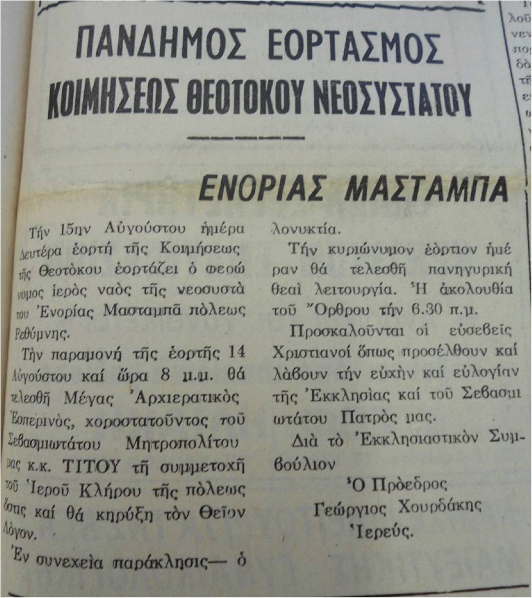 Ένας ναός στολίδι για τον Μασταμπά και για όλο το Ρέθυμνο αποτελεί ο συγκεκριμένος ναός για τον οποίο είναι αφιερωμένο το παρόν εορταστικό άρθρο, εν όψει της μεγάλης εορτής της Κοίμησης της Θεοτόκου. Η ενορία του Μασταμπά έχει μια πολυκύμαντη ιστορία την οποία θα παρουσιάσουμε πολύ επιγραμματικά , παρουσιάζοντας την πορεία που είχε από το 1934 μέχρι σήμερα.