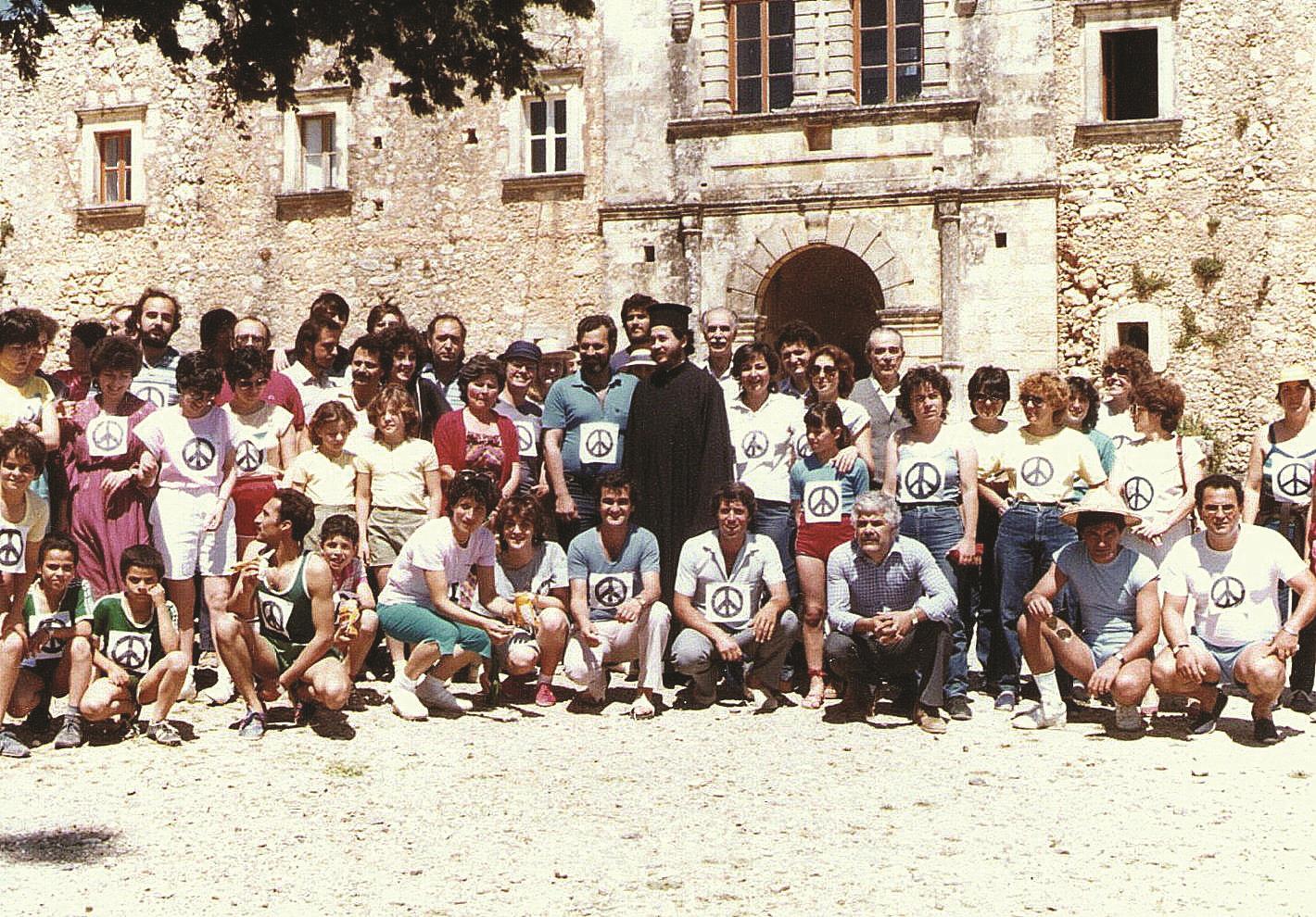 Για να κλείσω θετικά, όπως θετικά ήταν όλα στους εορτασμούς της επετείου, οι υπομονετικοί αναγνώστες θα μου επιτρέψουν να παραθέσω μια φωτογραφία, προκειμένου να επαναφέρω στη μνήμη των παλιότερων τις ξεχασμένες πορείες ειρήνης της δεκαετίας του 1980 από το Αρκάδι στο Ρέθυμνο. Σ’ αυτήν φαίνονται ο μακαρίτης σήμερα Ανδρέας Κούνουπας, μαζί με τον επίσης μακαρίτη πατέρα μου και με πολλούς άλλους Ρεθεμνιώτες, έτοιμοι να οδοιπορήσουν για το Ρέθυμνο. Όσοι είχαμε πάρει μέρος σε κάποιες από αυτές, τις θυμόμαστε με νοσταλγία, εξαιτίας όχι μόνο του θέματός τους αλλά και του αισθήματος συλλογικότητας που δημιουργούσαν. Αναρωτιέμαι λοιπόν σήμερα, που και οι κίνδυνοι για την ειρήνη δεν έχουν εκλείψει (προ μηνών ένας πύραυλος Stinger εξερράγη πάνω από το Ρέθυμνο!) αλλά και που το περπάτημα έχει πια μπει στη ζωή μας ως αναγκαιότητα για την υγεία, μήπως κάποιος φορέας του Ρεθύμνου, όπως για παράδειγμα η Εκκλησία, που εύχεται και μοχθεί για την ειρήνη, θα μπορούσε να τις ξαναζωντανέψει, με ανανεωμένο οπωσδήποτε το περιεχόμενό τους..