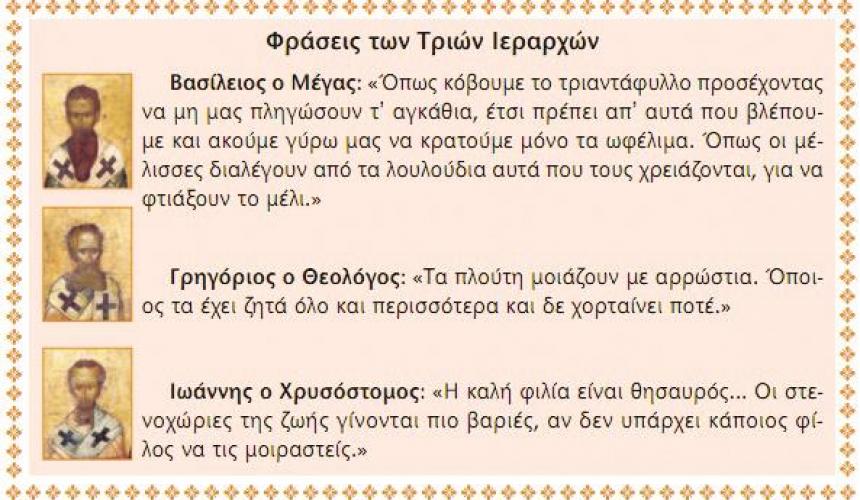 Τι κι αν έχουν περάσει τόσοι αιώνες από τότε που έζησαν: Το παράδειγμά τους είναι πάντα νέο, πάντα φωτεινό για να μας δείχνει το δρόμο. Η προσφορά των Τριών Ιεραρχών στην ανθρωπότητα είναι μοναδική. Θεμελίωσαν την Ορθοδοξία, γι’ αυτό και τους λέμε Πατέρες. Μορφώθηκαν ελληνικά και δίδαξαν ελληνικά. Οι μεγάλοι σοφοί της εποχής μας αντλούν από την ανεξάντλητη σοφία τους. Είχαν χαρίσματα και πήραν φροντισμένη αγωγή απ’ τα σπίτια τους και κυρίως από τις μητέρες τους, την Εμμέλεια, τη Νόνα και την Ανθούσα. Όμως με τη δική τους επιμέλεια, τον κόπο και την προσπάθεια έγιναν μεγάλοι. Αγωνίστηκαν ασταμάτητα, προσευχήθηκαν αδιάκοπα και ασκήθηκαν στον αγώνα της αρετής. Έτσι έγιναν οι πρωταθλητές της ευσέβειας, της αρετής, της αγιότητας αλλά και των γραμμάτων και της σοφίας.