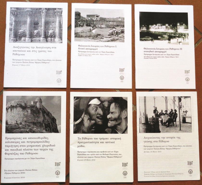 Θα ήθελα λοιπόν και από τη θέση αυτή να ευχαριστήσω όλους και όλες τις παραπάνω, όπως και τους υπεύθυνους των χώρων που φιλοξένησαν μέχρι σήμερα τις προβολές μας: τον Μπάμπη Μπιρλιράκη και το ξενοδοχείο Ιδαίον, τον Γιώργο Καλούδη και την Έκθεση του Τοπικού Τμήματος Δυτικής Κρήτης της Ελληνικής Σπηλαιολογικής Εταιρείας, τον Βασίλη Σιμιτζή και το Παλαιοντολογικό Μουσείο, την Εφορεία Αρχαιοτήτων για την χρήση του εγκάρσιου κλίτους του Αγίου Φραγκίσκου, την Ρένα Κουτσαλεδάκη για τη χρήση χώρου του βενετσιάνικου λιμανιού και την Αναστασία Πλατυρράχου για την προετοιμασία αλλεπάλληλες φορές της αίθουσας προβολών αλλά και του αύλειου χώρου του Ιστορικού και Λαογραφικού Μουσείου. Κι ακόμα τον Στέλιο Δασκαλάκη του ομώνυμου βιβλιοπωλείου για την δωρεάν αναπαραγωγή εκατοντάδων αντιτύπων, όπως και τον Κώστα Ανδρώνη για την επίσης δωρεάν προσφορά των γραφιστικών του υπηρεσιών στην παραγωγή οκτώ μέχρι σήμερα διαφορετικών φυλλαδίων. Μαζί μ’ αυτούς και τον Στέλιο Δαφέρμο, χάρη στις υπηρεσίες του οποίου λύνονταν πάντα τα αναπόφευκτα προβλήματα ήχου και εικόνας για τους εκατοντάδες συμμετέχοντες στις ξεναγήσεις.
