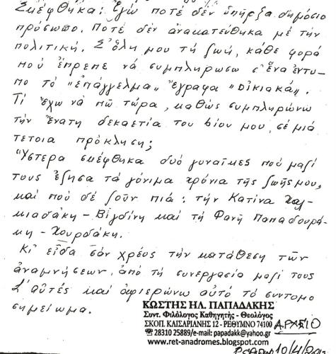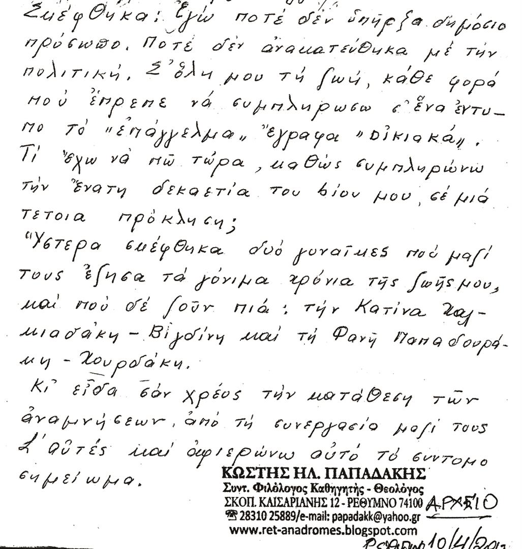Η Κυρία Μαρία μού το παρέδωσε και μου ζήτησε να το αξιοποιήσω όταν και όπως εγώ θα ήθελα. Αντιλαμβανόμενος το ενδιαφέρον τού εν λόγω «αυτοβιογραφικού» σημειώματος, της έδωσα την υπόσχεση ότι ναι, πράγματι, κάποια στιγμή, θα το αξιοποιούσα κατάλληλα, ενώ εκείνη με αφοπλιστική σεμνότητα, όλως φυσικά κι ανεπιτήδευτα, μου απάντησε, και πάλι, απλά: «Κράτησέ το, Κώστα, στο Αρχείο σου!» …