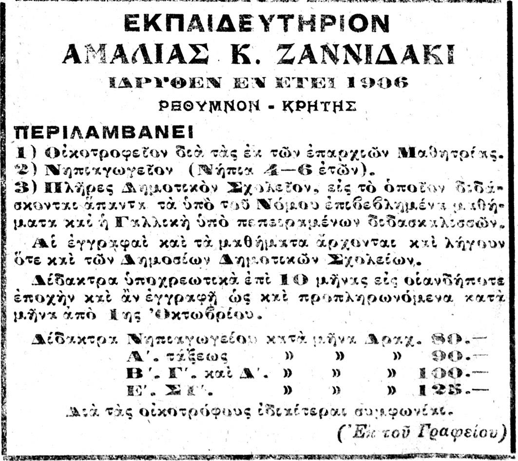 Αγγελία επαναλειτουργίας του νηπιαγωγείου Μανουσάκη, μετά την μετατροπή του από δημόσιο σε ιδιωτικό. Η αγγελία δημοσιεύτηκε στην «Κρητική Εφημερίδα» τον Σεπτέμβριο του 1901. Από το 1906 δίπλα στο νηπιαγωγείο ξεκίνησαν να λειτουργούν και τάξεις δημοτικού σχολείου.